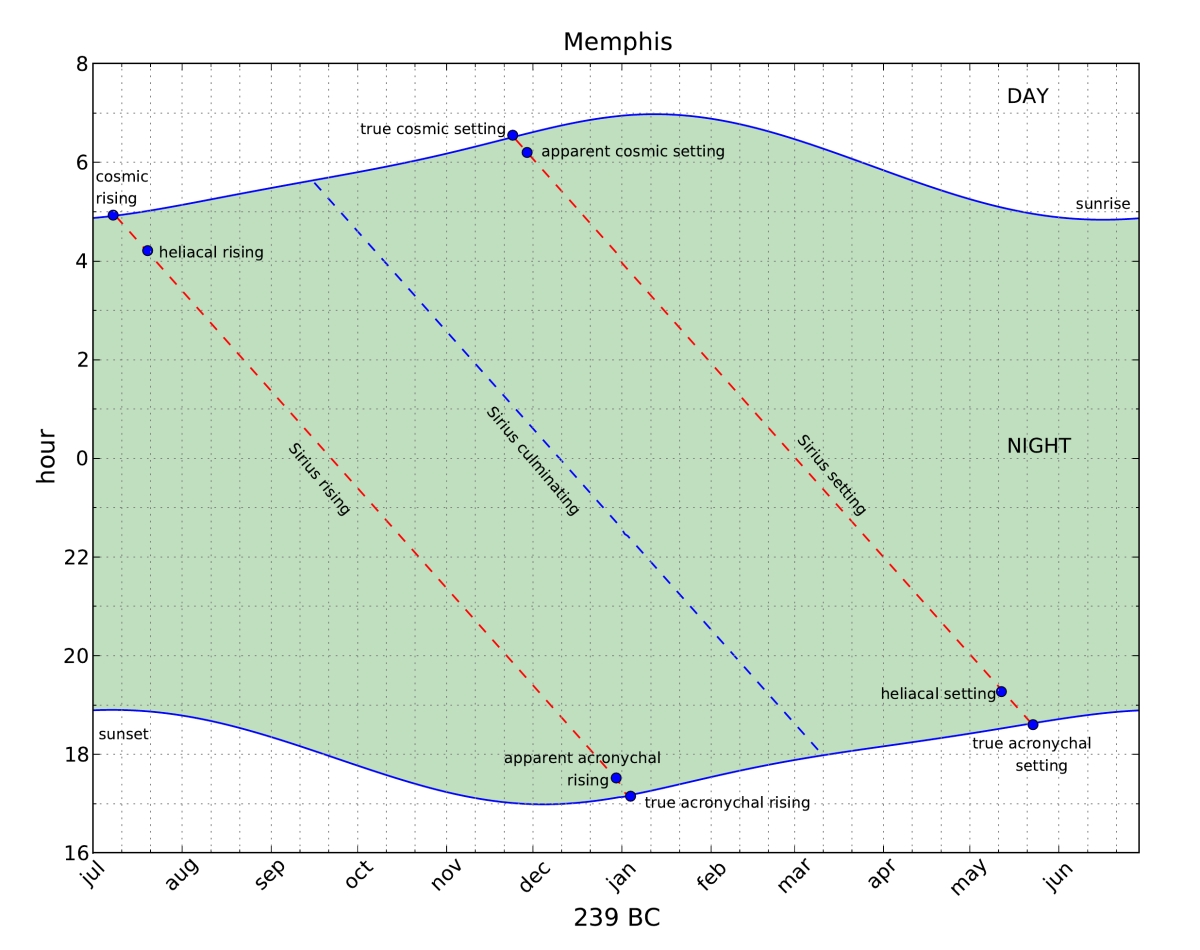In the course of the year, Sirius is visible at different phases of the night sky. Figure 1 shows the various phenomena of Sirius for the site Memphis in the year 239 BC (year of the so called Canopus decree) for an assumed arc of vision of 10° and an apparent altitude above the horizon of 3° [1]. On the vertical axis hours are plotted (0h designates midnight), on the horizontal axis months and days are listed.
