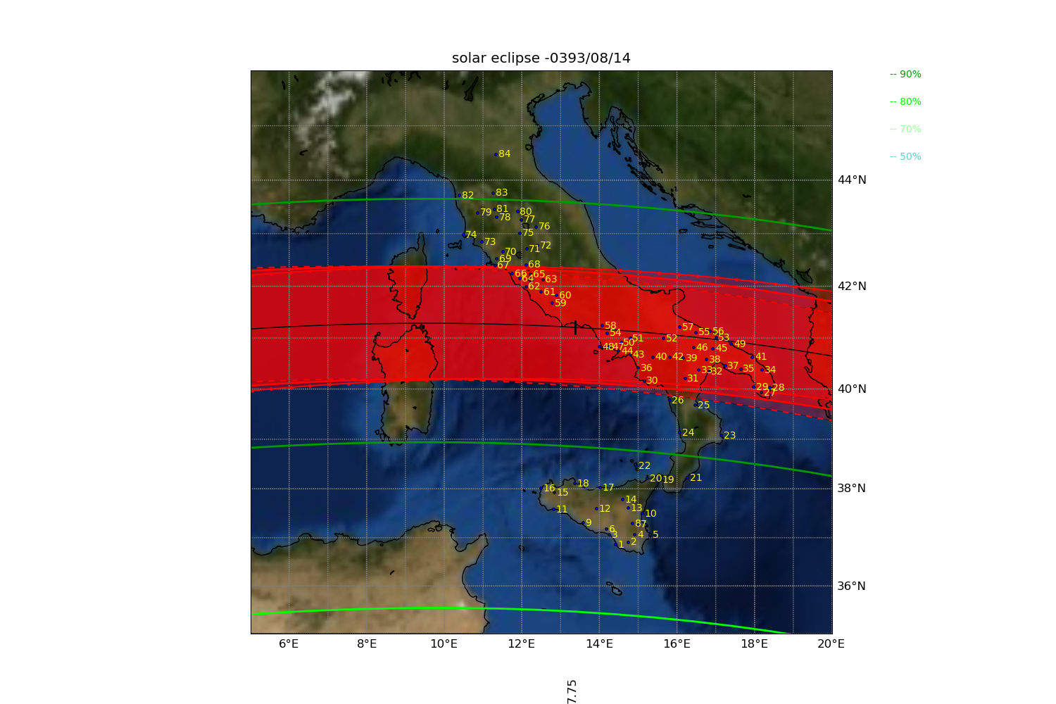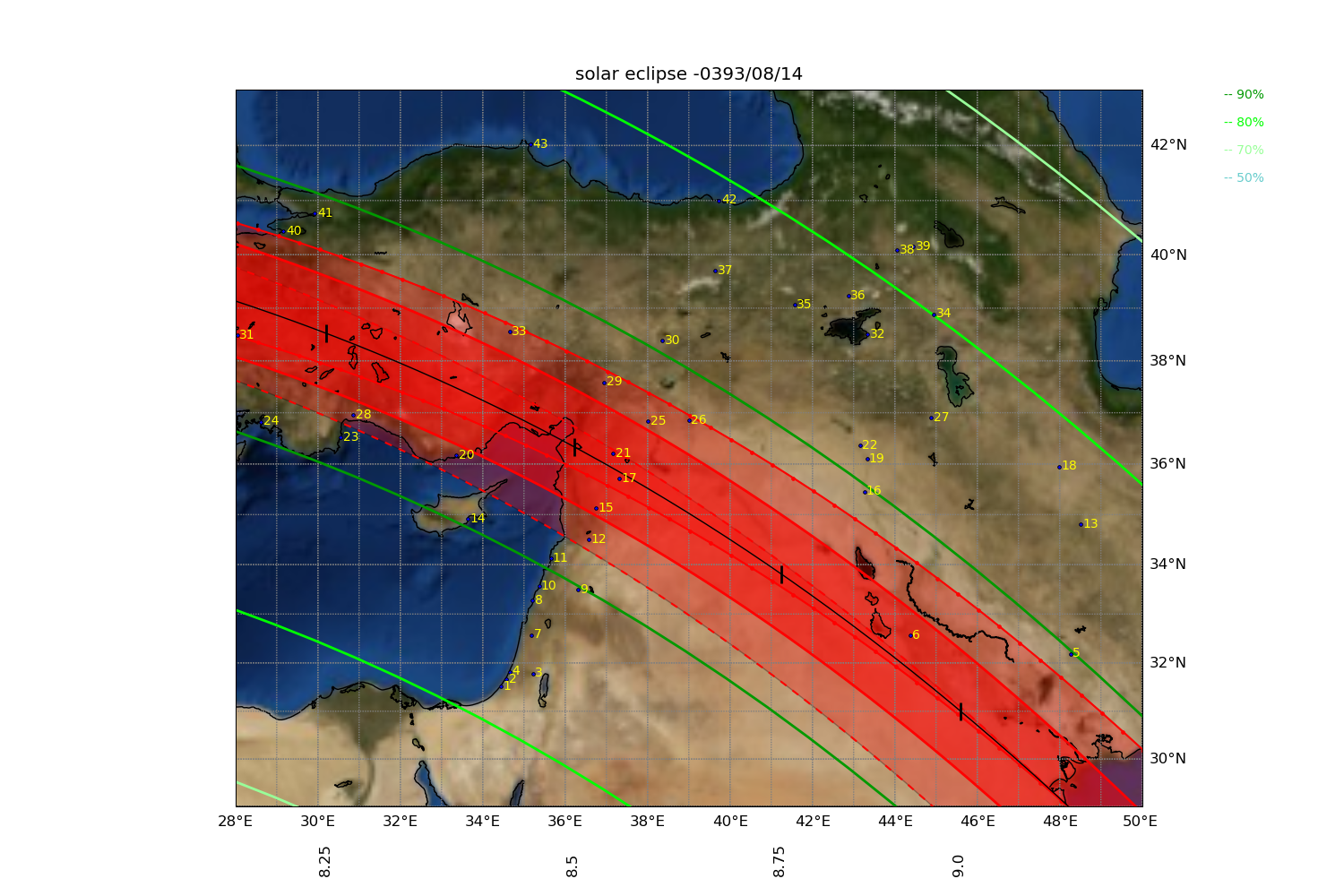 | tbeg: | Beginnzeit der Sonnenfinsternis in Terrestrischer Dynamischer Zeit (TDT): ein negativer Wert zeigt an, dass die Finsternis am Vortag begann |